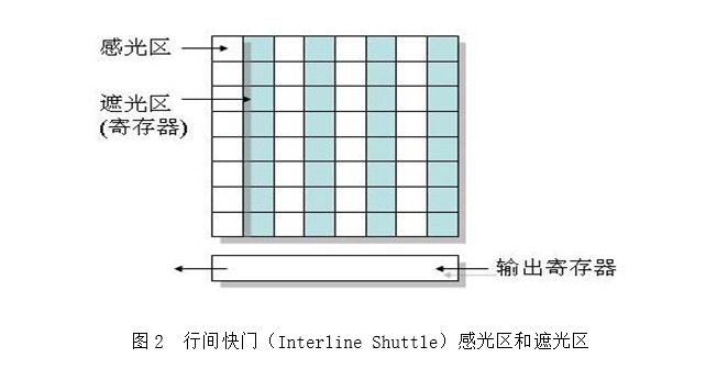 对于行间快门,感光材料实际上分为感光区(light-sensitive cell)和遮光存储区(shaded shift registers),示意图如图2所示:
