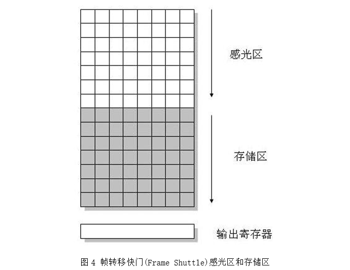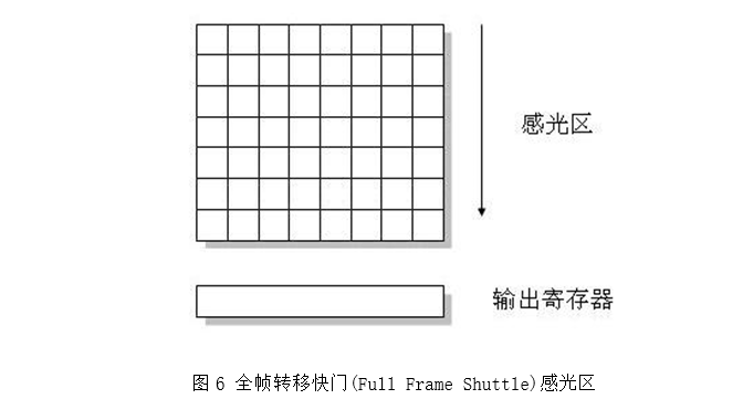 对于帧转移快门,感光材料也存在着感光区和存储区,但位于两个不同的位置。这种感光材料的实际面积要2倍于行间快门结构的感光材料,所以CCD的感光平面上都是像素感光单元,感光灵敏度可以很高。但这种结构的缺点是一个时钟周期内,像素的信号只能传递出去一次,所有像素的信息传递需要n个(n为感光材料的垂直分辨率)周期才能完成传递过程,因此速度受到一定的影响。