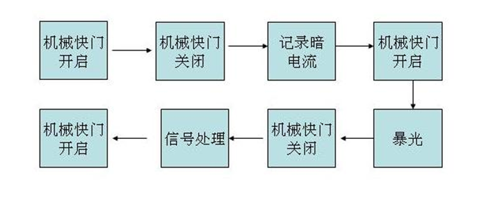 最后讨论一下机械快门在数字相机中的作用。在数字相机中保留机械快门的目的之一是可以记录感光材料的暗电流信息。数字相机的机械快门和传统相机是不一样的,平时是打开着以便电子取景器取景。再曝光前再关闭,复位感光器件上的存储信息,并记录各个像素的暗电流资料。接下来进行曝光。机械快门开启,曝光结束后关闭机械快门,将曝光数据进行DSP处理。流程如下: