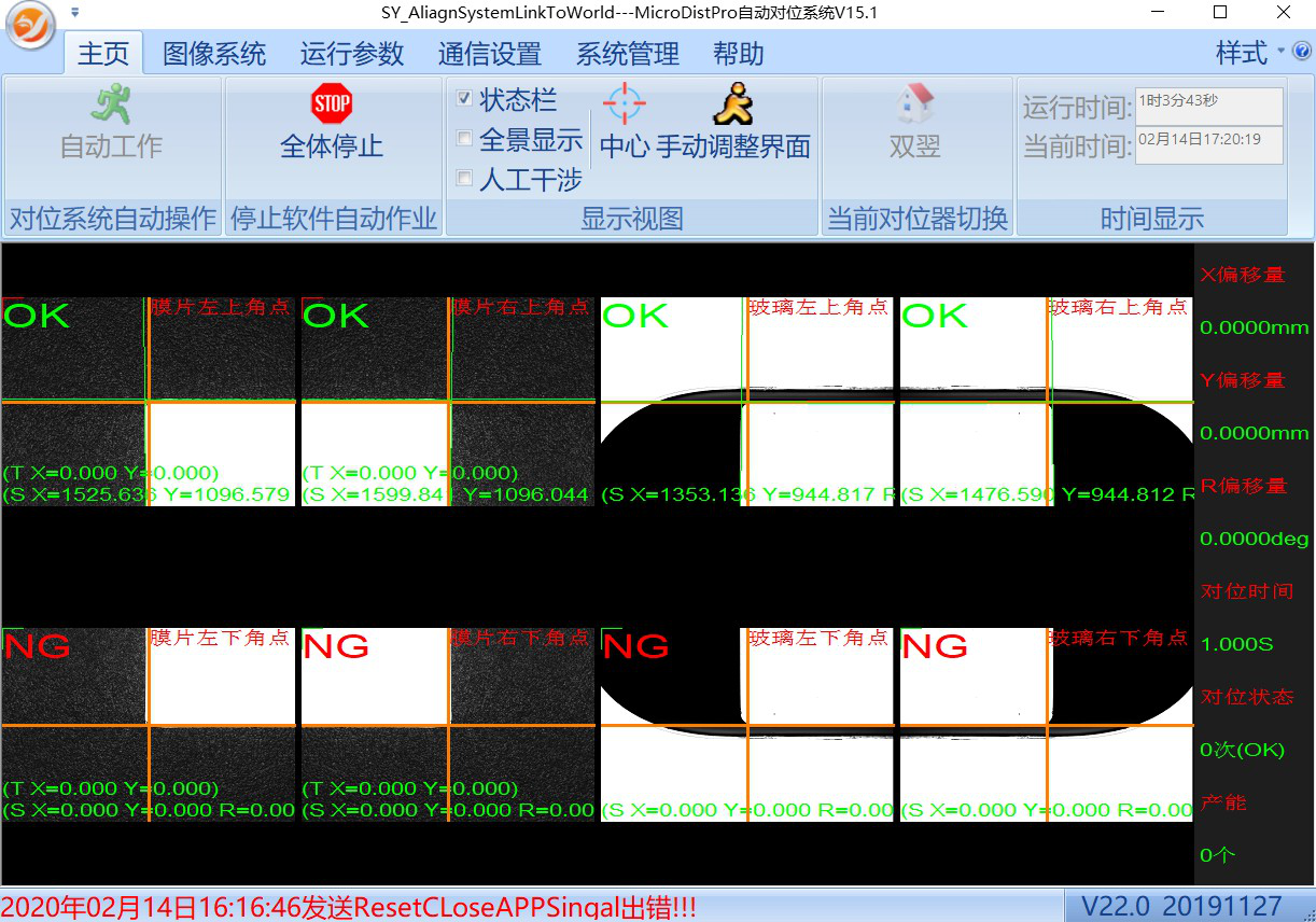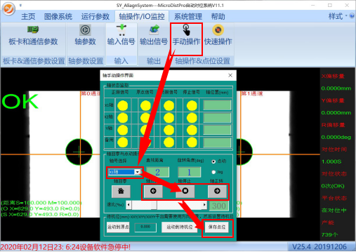 ◆ 设置待机位之前需要启动复位进行平台回零,回零完成后点击“轴操作/IO 监控”->“手动操作”弹出轴操作界面,选择 X1 轴,填写点动距离,通过手动点击正反转操控 X1 轴到限位中间位置,最后点“保存点位”。同理设定 X2 轴和 Y 轴的待机位置,如此便完成了对位平台待机位的设定。