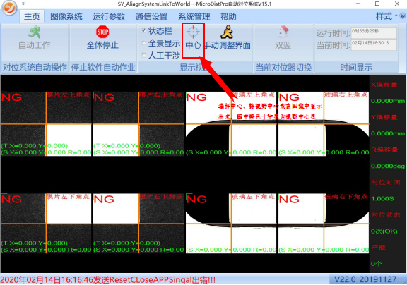 软件上点击中心,在图像中可以看到橙色的十字线,这个为视野中心,在产品上料过程中,我们需要将产品放置到橙色十字交点即视野中心位置。