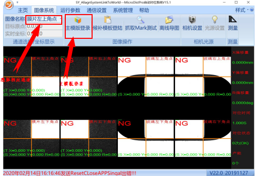 ? Step1:如图 7 所示,通过“通道名称”处选择我们要进行模板学习的通道:“膜片左上角点”,然后点击“主模板登录”进行图像的模板学习。