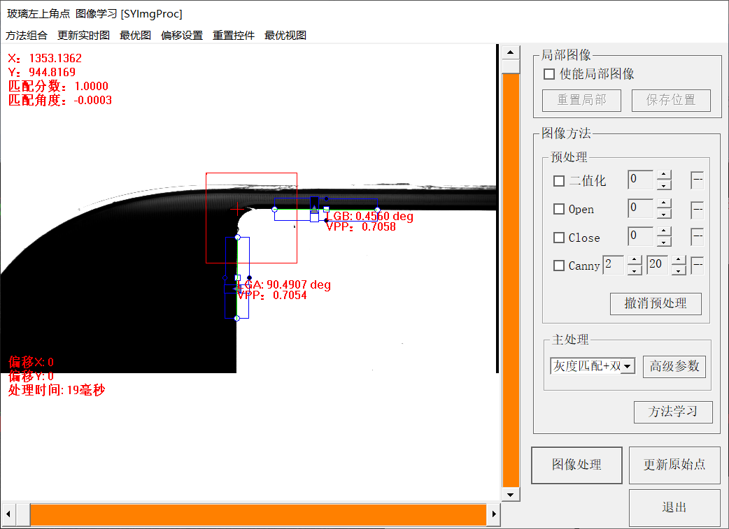 ? Step2:如图 8 所示,下拉重新选择“灰度匹配+双直线”,黄色的模板框工具和蓝色的直线工具则会显示出来,通过拖拽调整先使两个直线工具的中线分别与产品的水平边和垂直边的边缘相接,然后调整模板框位置和大小到合适,再点击“方法学习”,则学习记录当前的模板。注意直线工具的极性和找边方向。