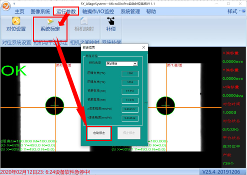 ◆ 系统全体停止的状态下点击“运行参数”->“系统标定”,弹出标定界面后,点击“启动标定”即可开始标定,系统提示标定完成即完成标定。