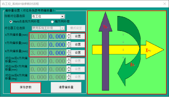 ◆ 根据补偿方向图示,在右侧对应的方向补偿写入补偿数值后,点击“设置”累加到左侧的总补偿参数中。设置完补偿参数退出前必须要点击“保存参数”,补偿才能生效。