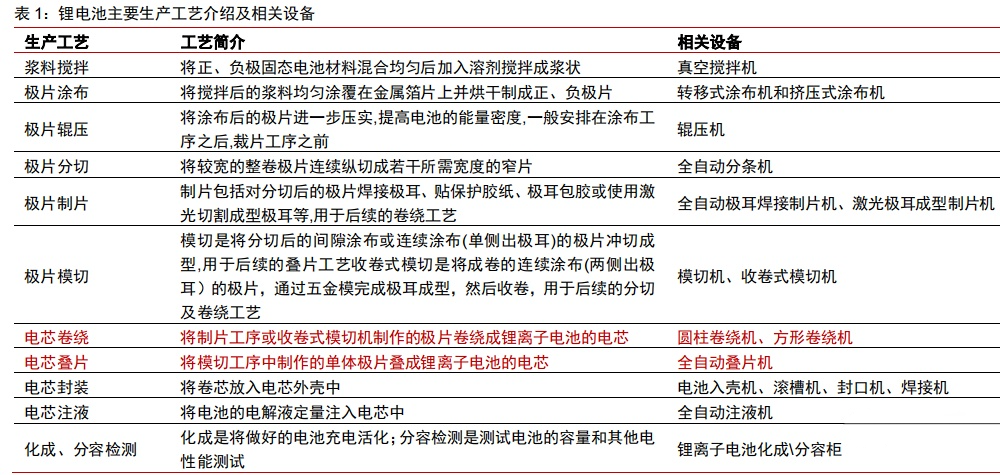 锂电池制造可统一分为极片制作、电芯组装、电芯激活检测和模组/Pack 封装四大工序,其中,电芯组装属于中段生产环节,主要包括卷绕或叠片、电芯预封装、电芯注液等工序。卷绕是指将制片工序或收卷式模切机制作的极片卷绕成电芯,叠片指的是将模切工序中制作的单体极片叠成电芯。通常来说,卷绕用于方形和圆柱电池,叠片用于方形和软包电池。根据 GGII 测算数据,在锂电设备中,中段设备价值量占比约为 35%,其中,卷绕/叠片机是中段设备的核心,价值量占比约 70%。