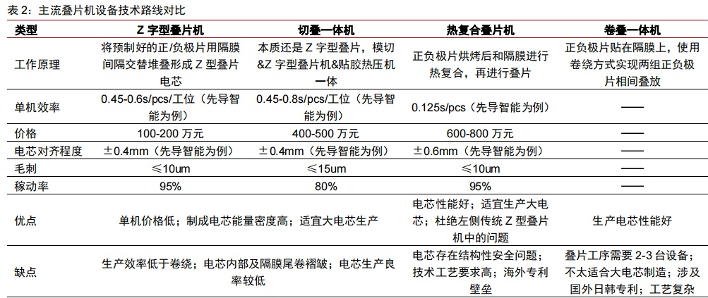 在模切工序,传统卷绕采用双边模切,模切极耳间距不等,冲切位置有 Mark 孔进行定位;而叠片采用单边模切,极耳间距相同,会进行等间距切断。在极组成型工序,卷绕正负极片连续,叠片是片状物料,在层数相同的情况下,相较于卷绕电池,叠片电池的极耳数量多一倍,同时隔膜张力几乎为零,孔隙率和原材料保持一致。目前市场上主流叠片机设备路线主要有 Z 字型叠片机、切叠一体机、热复合叠片机和卷绕一体机四种,其中 Z 型叠片目前在国内应用最广泛,热复合叠片机技术难度更高,卷叠一体机涉及到日韩专利,国内应用较少。