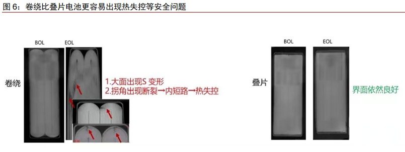 叠片电池安全性更高。在电池循环过程中,卷绕电池拐角处内应力无法充分释放,可能导致拐角处断裂,进而产生脱粉、毛刺等问题,甚至引发电池内短路,带来热失控风险。而叠片电池拐角处受力均匀,大大降低电池安全风险问题。