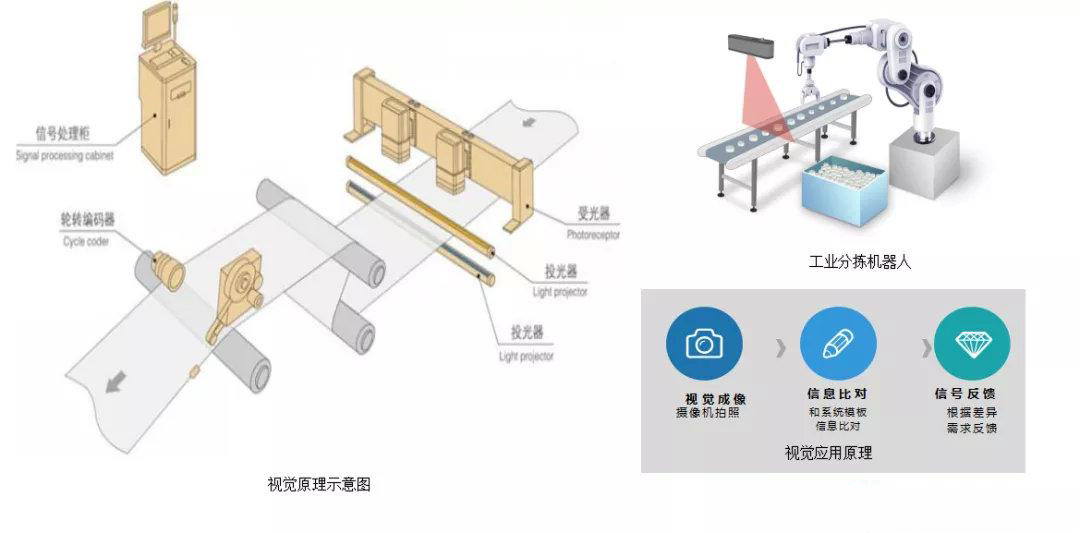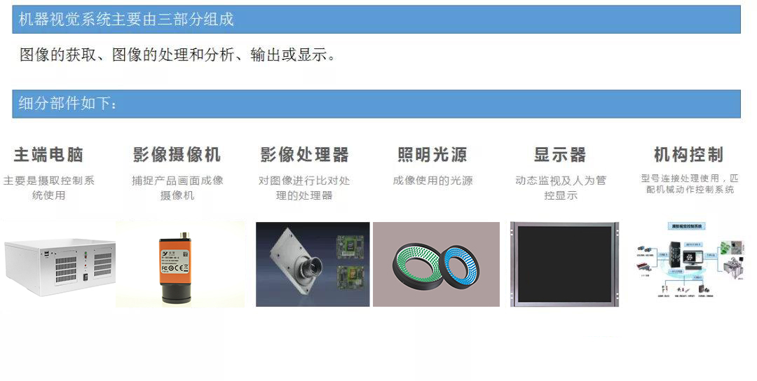 机器视觉是配备有传感视觉仪器(如自动对焦相机或传感器)的检测机器,主要研究计算机来模拟认的视觉功能从客观事物图像中提取信息,进行处理并加以理解,最终用于实际检测(监测),测量、定位和控制。其中光学检测仪器占有比重非常高,可用于检测出各种产品的缺陷,或者用于判断并选择出物体,或者用来测量尺寸等,应用在自动化生产线上对物料进行校准与定位。是计算机视觉中最具有产业化的部分,主要大量应用于工厂自动化检测及机器人产业等。