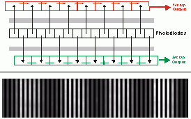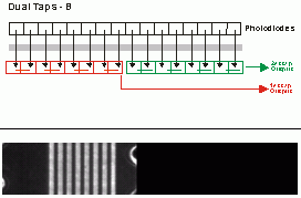 通常是在高解析或为了提高Line-scan Camera 传输速度的设计, 它的特性是整个线性CCD的每个光电二极管在感光后分成奇数及偶数将光转成电荷讯号分成两组将数据传递出去。