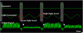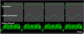 ① 下图所示为一般区域扫描 (Area-scan) 摄影机 (取像速度大约在30fps) 在一般室内日光灯源 (交流电源, 频率为60Hz) 下的示波器取像讯号。日光灯的闪烁频率对这样的摄影机的曝光时间而言, 并不会有太大影响, 使用者仍然可以取得亮度均匀的影像。