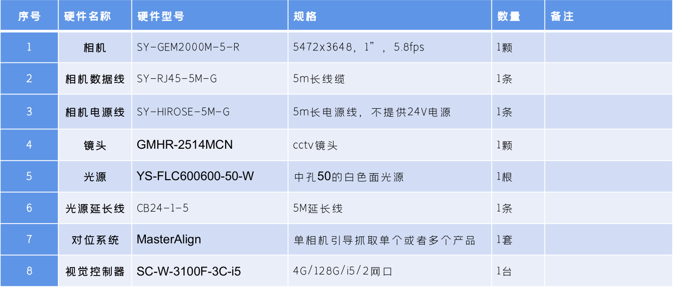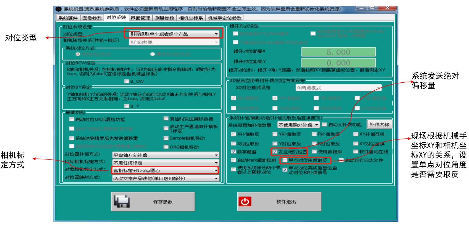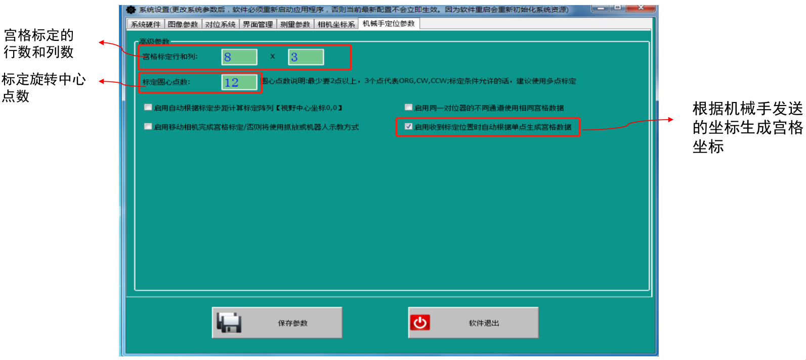 系统采用宫格标定,自定义行列数和间距及旋转角度,通过机械手发送的当前机械坐标,视觉软件自动计算出宫格机械坐标,视觉软件与机械手进行网口通讯,机械手吸取物料到达指定的机械坐标,相机拍摄物料计算出像素坐标和机械坐标的关系。