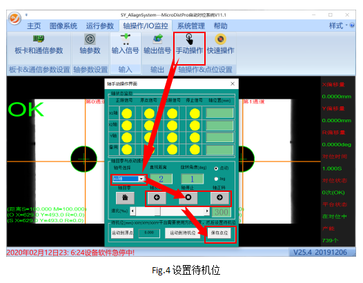 设置待机位之前需要启动复位进行平台回零,回零完成后点击“轴操作/IO监控”->“手动操作”弹出轴操作界面,选择X1轴,填写点动距离,通过手动点击正反转操控X1轴到限位中间位置,最后点“保存点位”。同理设定X2轴和Y轴的待机位置,如此便完成了对位平台待机位的设定。
