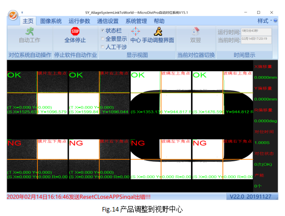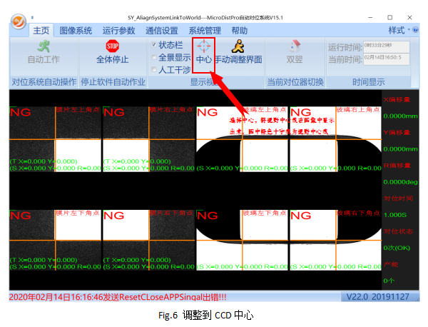 软件上点击中心,在图像中可以看到橙色的十字线,这个为视野中心,在产品上料过程中,我们需要将产品放置到橙色十字交点即视野中心位置。