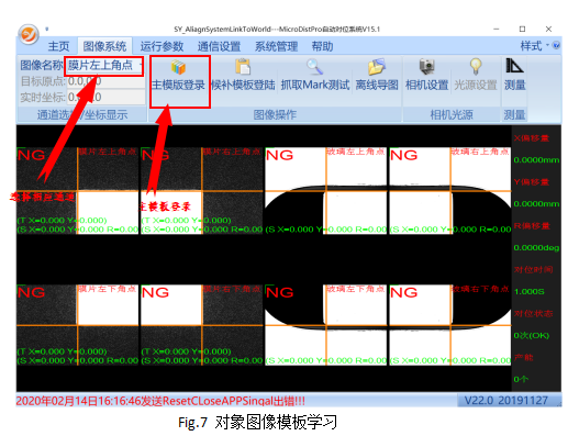 Step1:如图7所示,通过“通道名称”处选择我们要进行模板学习的通道:“膜片左上角点”,然后点击“主模板登录”进行图像的模板学习。
