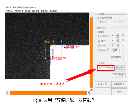 Step2:如图8所示,下拉重新选择“灰度匹配+双直线”,黄色的模板框工具和蓝色的直线工具则会显示出来,通过拖拽调整先使两个直线工具的中线分别与产品的水平边和垂直边的边缘相接,然后调整模板框位置和大小到合适,再点击“方法学习”,则学习记录当前的模板。注意直线工具的极性和找边方向。