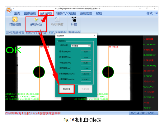 系统全体停止的状态下点击“运行参数”->“系统标定”,弹出标定界面后,点击“启动标定”即可开始标定,系统提示标定完成即完成标定。