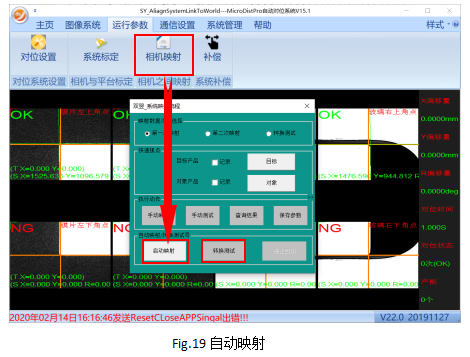 系统全体停止的状态下,打开相机映射界面,放置好TP,点击“启动映射”,抓点OK完成第一次映射后,然后重复再做第二次映射。再点击“转换测试”进行一次转换测试。