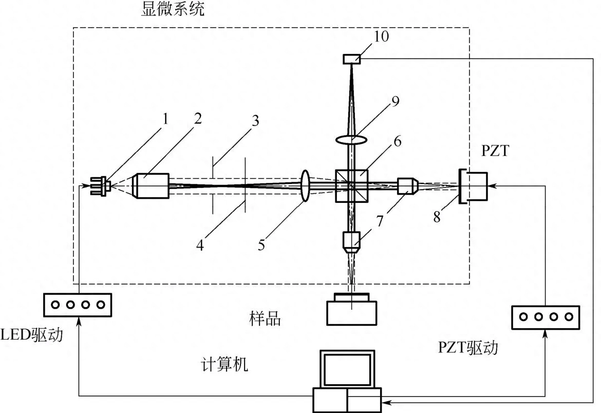 1—LED;2—准直物镜;3—光圈;4—过滤片;5—聚焦透镜;6—分束器;7—物镜;8—参考镜;9—成像镜头;10—CCD