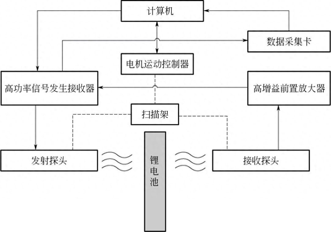 首先通过高功率信号发生器激励发射探头发出超声波,超声波经过锂电池后被接收探头获取,再经放大器对信号进行滤波放大,被信号接收器接收,经数据采集卡输入到计算机。计算机通过控制电机运动控制器和扫描架来实现特定参数的扫描任务,最后形成相关的扫描图像,实现对锂电池的检测。