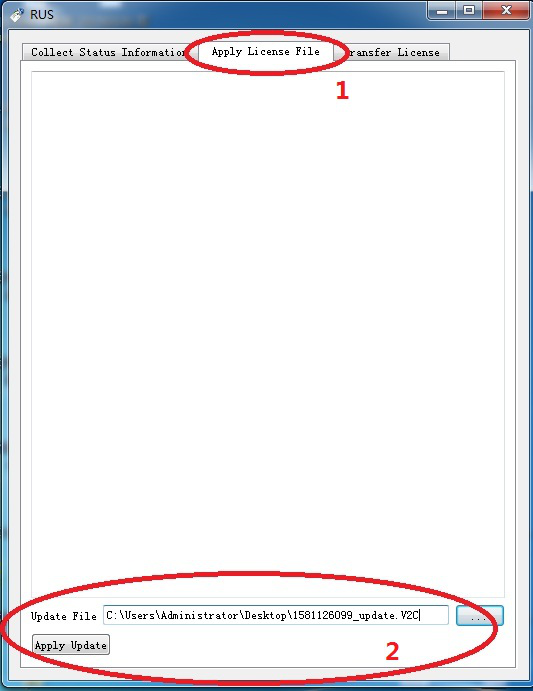 打开“RUS_Info_For_MD.exe”选择“Apply License Files”栏【如图5中标识1所示】,选择相应的V2C文件【如图5中标识2所示】,然后进行“Apply Update”升级即可。