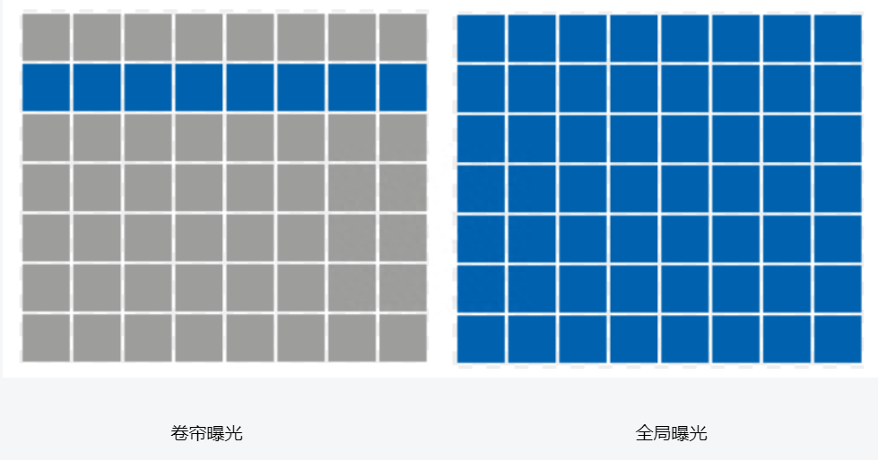 传感器的所有像素点同时收集光线,同时曝光。当预设的曝光时间到了,传感器停止收集光线,并将曝光图像转成电子图像。