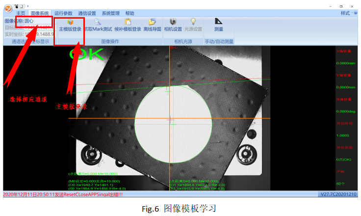 ? Step1:如图6所示,通过“通道名称”处选择我们要进行模板学习的通道:“圆心”,然后进行“主模板登录”进行图像的模板学习。