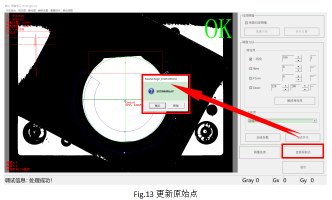 更新靶标原始点的作用是将当前通道的直线的较底与圆心坐标作为产品基准角度和XY基准坐标