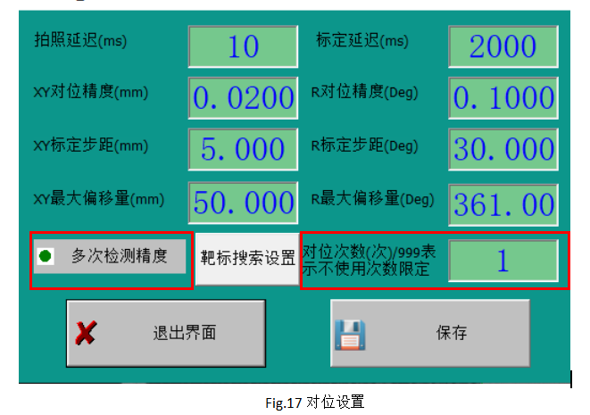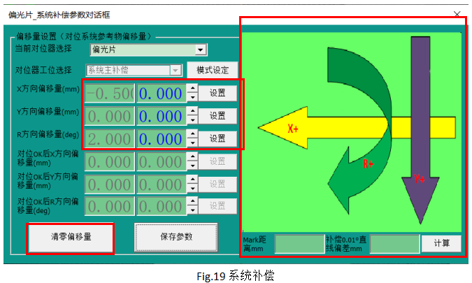 根据补偿方向图示,在右侧对应的方向补偿写入补偿数值后,点击“设置”累加到左侧的总补偿参数中。设置完补偿参数退出前必须要点击“保存参数”,补偿才能生效。