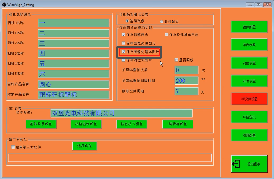 2.找到【UI/文件设置】,如图所示勾选【保存图像处理NG图片】