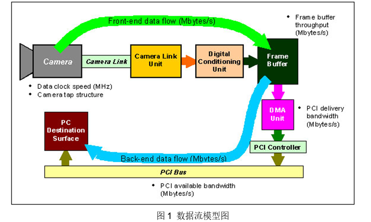 数据流进入图像采集卡和从采集卡到PC的内存缓冲区的速率不应超过图像采集卡的吞吐量。后端数据流的吞吐量不应超过PCI总线的有效带宽。