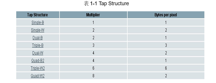 为了计算前端数据流的峰值数据流量,使用相机的像素时钟(Data Clock Speed)乘以Tap(数据传输通道)来表示,Tap 结构如下表所示: