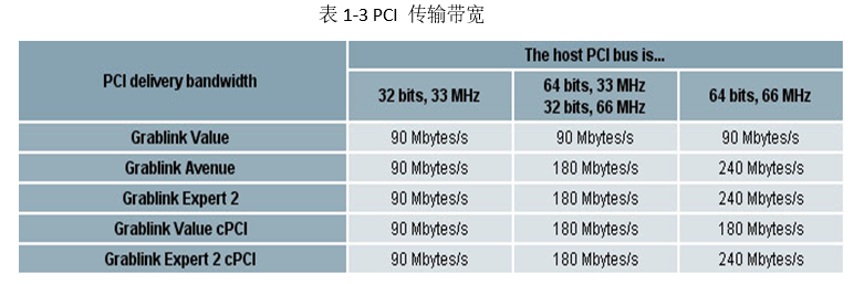 通过表1-5可知,在做采集图像的同时将采集到的图像保存到PC内存中,总共的数据量为334MByte/S,而Grablink Expert2的帧缓存区实际吞吐量为680MByte/S,同时要保证后端数据流速度要比PCI有效带宽小,这样将图像存储到内存中才不会丢失。从表1-4我们可以知道后端数据流为167MByte/S,如果主机的PCI总线拥有64bits 33Mhz或32bits 64Mhz(这种情况下PCI的传输带宽为 180MByte见表1-3所示),累计的后端数据流为167MByte/s,有足够的传送带宽来将图像存储到内存中。所以此卡,可满足上述的应用。