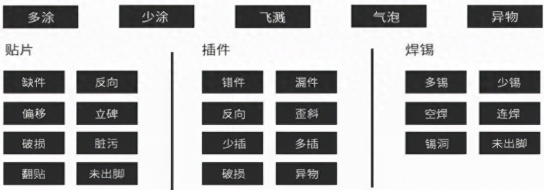 少锡、多锡、连锡、不出脚/缺件、空焊、虚焊/锡洞
