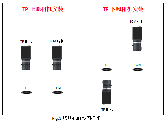 相机的安装方向:以操作者站立调试的位置为基准(一般就是显示器的位置),相机的螺丝孔面朝向操作者,标签面(即正面)远离操作者。这样才能保证实际图像和显示器图像保持一致性,方便调试。