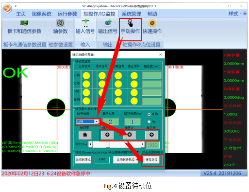 设置待机位之前需要启动复位进行平台回零,回零完成后点击“轴操作/IO监控”->“手动操作”弹出轴操作界面,选择X1轴,填写点动距离,通过手动点击正反转操控X1轴到限位中间位置,最后点“保存点位”。同理设定X2轴和Y轴的待机位置,如此便完成了对位平台待机位的设定。