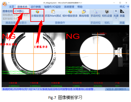 ? Step1:如图7所示,通过“通道名称”处选择我们要进行模板学习的通道:“LCM圆心”,然后进行“主模板登录”进行图像的模板学习。