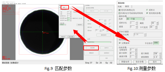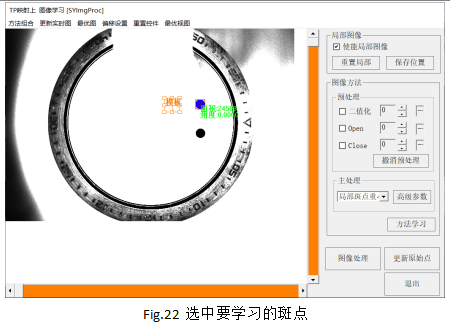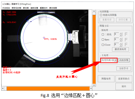 ? Step2:如图8所示,下拉重新选择“灰度匹配+圆心”,黄色的模板框工具和蓝色的圆心工具则会显示出来,通过拖拽调整使圆心工具的中环与Mark圆形边缘相接,模板框位置和大小到合适,再点击“方法学习”,则学习记录当前的模板。