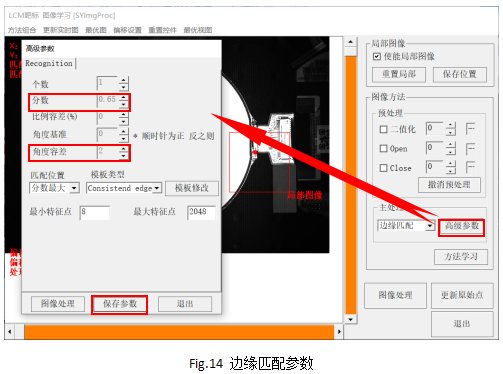 ? Step4:调整高级参数。点击“高级参数”,进入高级参数界面,调整参数如下图14所示。可根据实际情况修改“分数”、“角度容差”参数,修改完成后点击保存。