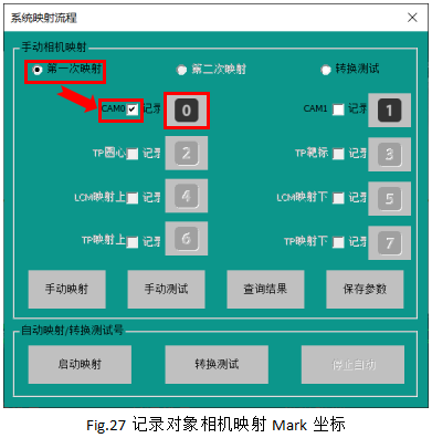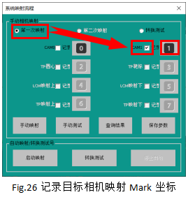 1) 系统全体停止,将带有两个Mark点的TP搬运到目标相机下,打开映射界面,勾选第一次映射,再勾选目标相机CAM1,点击记录按钮,系统会抓取两个Mark点的坐标。