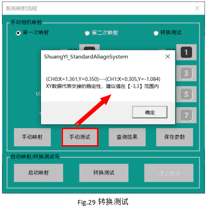 4) 重复1)、2)步骤,再搬运一次TP,抓点OK后点击手动测试。CH数据需要在【-3~3】范围内才算映射合格。代表产品交接稳定,否则需要检查抓点问题和机构交接的稳定性问题。