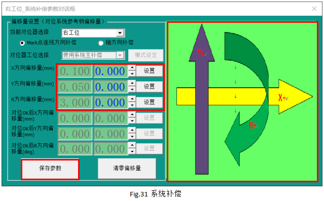 根据补偿方向图示,在右侧对应的方向补偿写入补偿数值后,点击“设置”累加到左侧的总补偿参数中。设置完补偿参数退出前必须要点击“保存参数”,补偿才能生效。