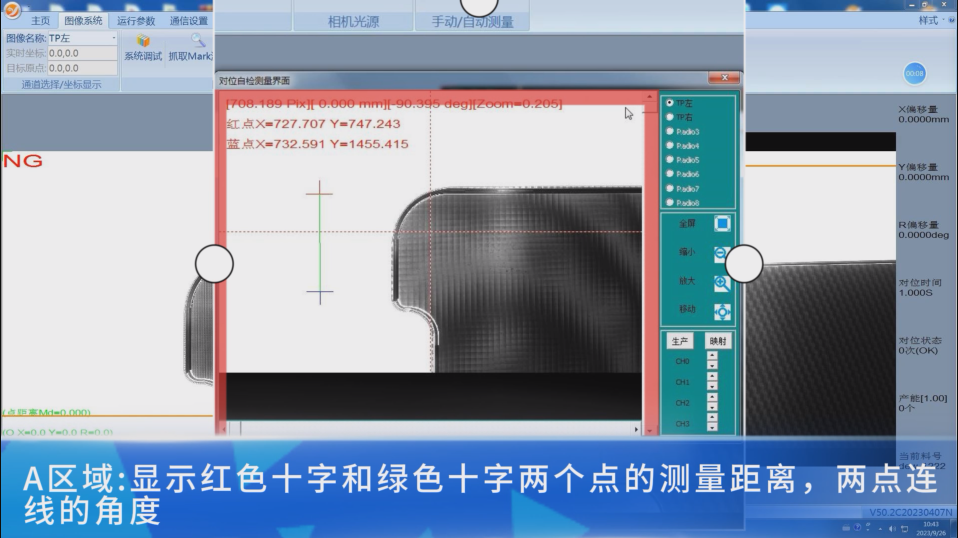 区域A - 显示红色十字和绿色十字两个点的测量距离,两点连线的角度。