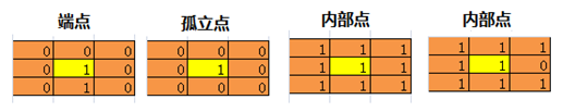 2. 接下来,把目地图像再次复制到临时图像,接着对临时图像进行一次扫描,如果不为0的点它的八邻域满足以下4个条件,则在目地图像中删除该点(就是设置该像素为0)