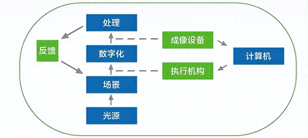 在设定光源的照射下,场景内的物体通过成像设备生成原始的数字图像,并输送到计算机系统中;然后图像在计算机中进行计算,完成图像的预处理;到这里,图像的质量已经得到了一定的改善,接下来计算机会从质量较好的图像中提取特征,构成了对原始图像的抽象描述;最后,计算机对抽象特征运用模式识别技术,得到更高层次的抽象描述。期间的图像处理过程,可以通过显示器展现出来,另外,计算机还可以根据图像处理结果对工作过程进行调整。