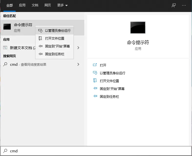第一步:Win键加Q键打开搜索输入cmd右键命令提示符,选择以管理员运行