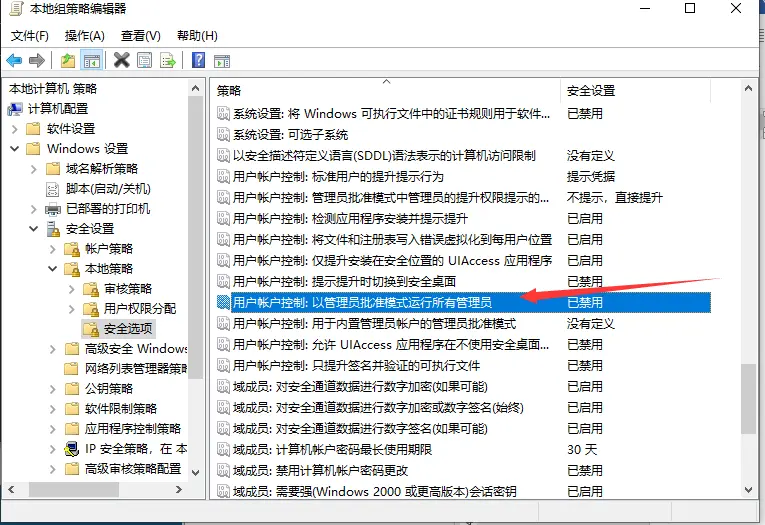 第三步:在本地组策略编辑器左侧计算机配置依次打开“Windows设置”“安全设置”“本地策略”“安全选项”,然后在窗口右侧找到“用户账户控制-以管理员模式批准运行所有管理员”这一项;