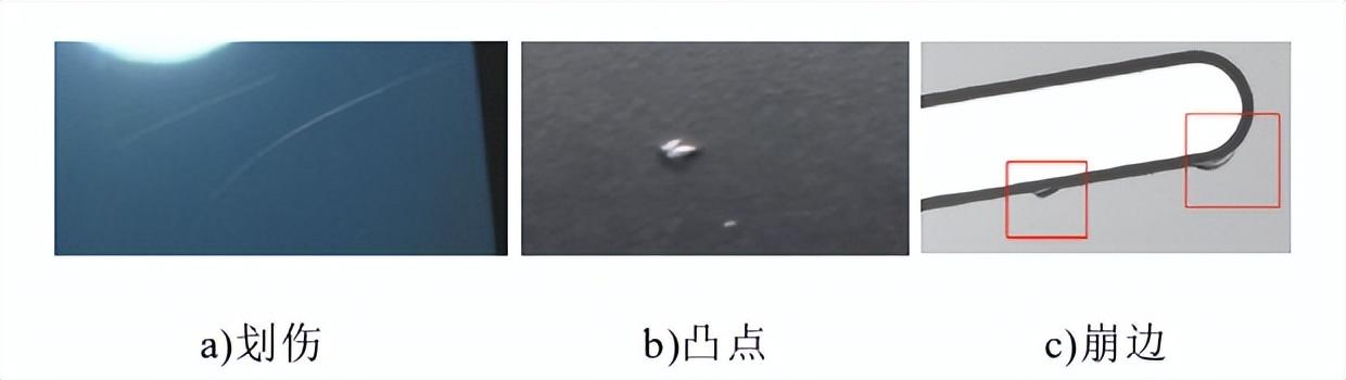 智能手机玻璃盖板表面典型缺陷按生产工艺分,可分为外部异物、加工缺陷及丝印不良。其中外部异物包括:脏污、尘点、毛丝;加工缺陷包括:划伤、崩边、凹凸点;丝印不良包括:溢墨及少墨。