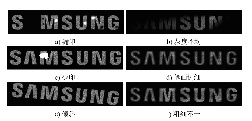 智能手机玻璃盖板表面典型缺陷按特征区域分,可分为屏幕区缺陷、丝印区缺陷、字符缺陷、IR孔缺陷、相机孔缺陷。其中屏幕区、丝印区、IR孔及相机孔缺陷种类相同,这几个部分的缺陷提取算法一致。而字符区域较为特殊,包括漏印、少印、倾斜、灰度不均、笔画粗细不均等缺陷。以上部分特征区域虽然缺陷类型相同,但对缺陷的容忍度存在差异,故仍要分别检测。