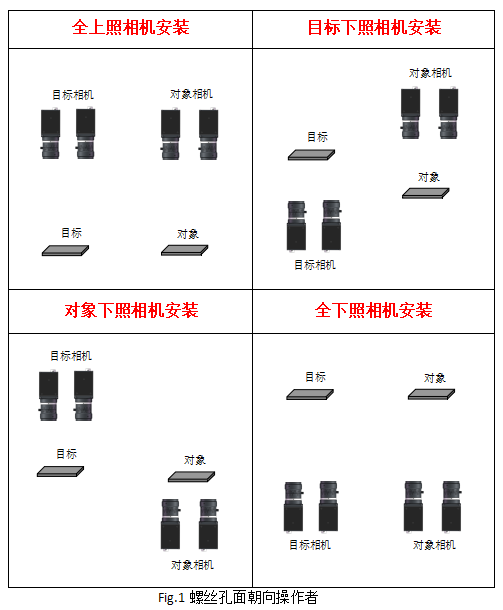 相机的安装方向:以操作者站立调试的位置为基准(一般就是显示器的位置),相机的螺丝孔面朝向操作者,标签面(即正面)远离操作者。这样才能保证实际图像和显示器图像保持一致性,方便调试。